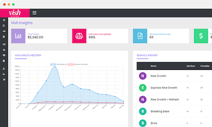 The Vish Dashboard offers insights into a salon's color business; key reports on usage, waste, and applications, in addition to team member performance and guest records.