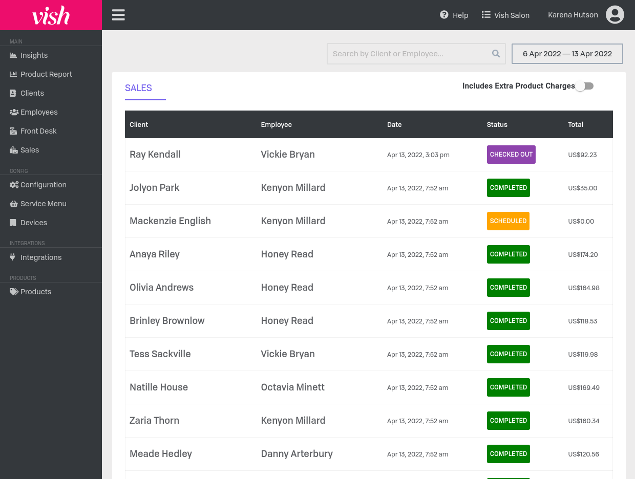 The Sales page provides a summary of the open or closed orders for your location to ensure accurate reporting, and that your clients are properly charged for extra products.