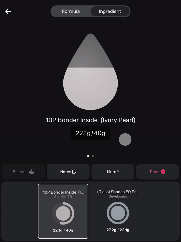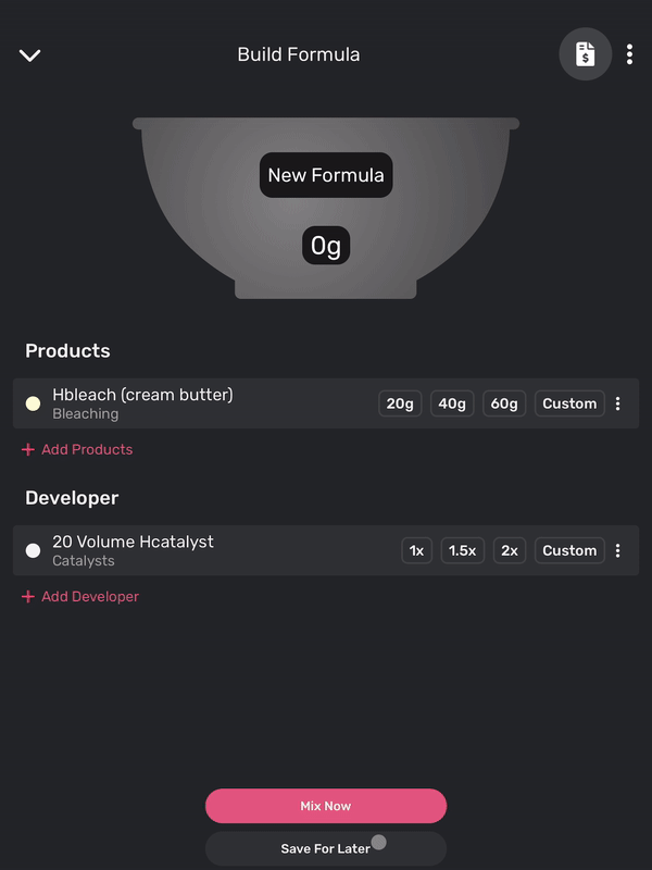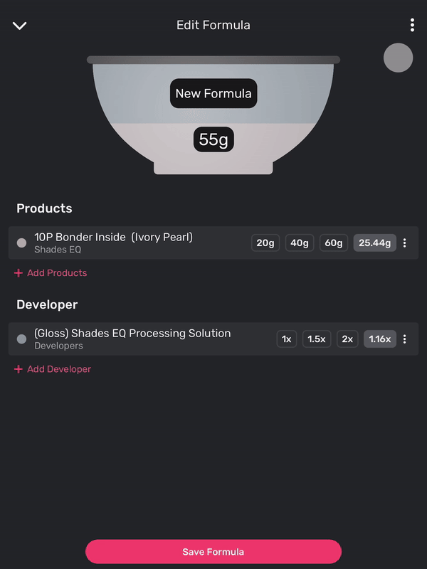 - The next screen is your formula builder screen where you can pre-set how much product you’d like to mix for your formula as well as choose a developer ratio. It also gives you the opportunity to Add Products or Developers if some were missed while choosing products initially.
