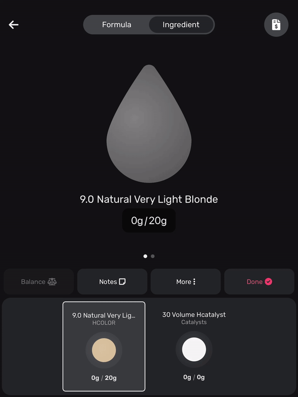 While mixing a formula in Vish, the Service Summary icon on the top right hand corner is white. If the stylist mixes more than their Product Allowance, it will turn red.